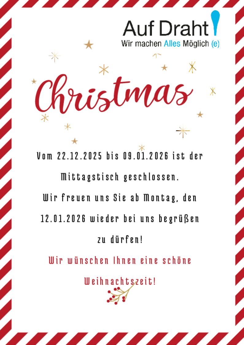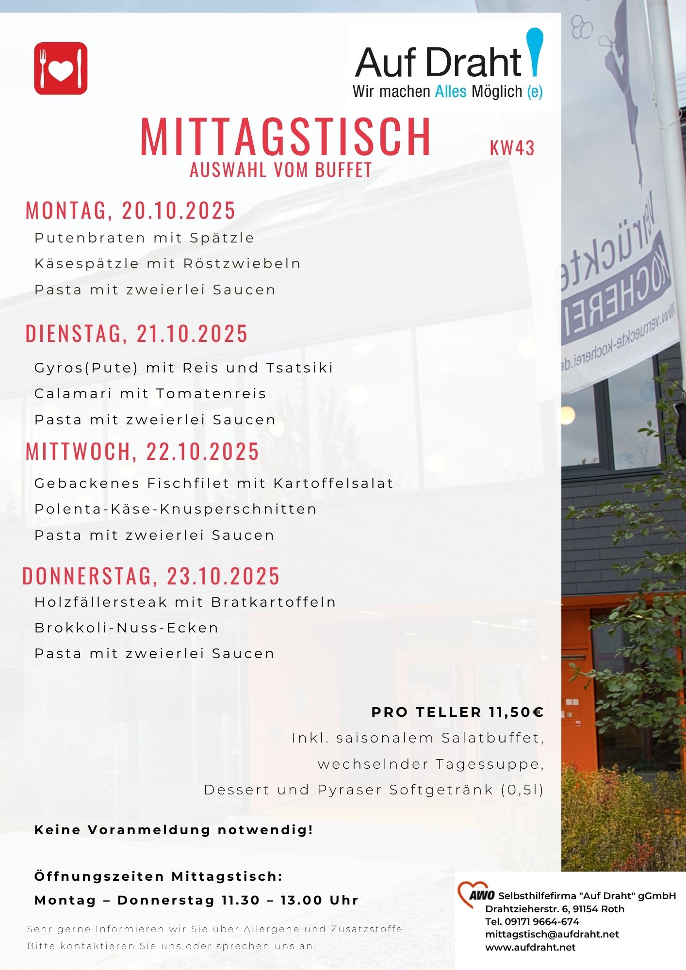 Von Montag bis Donnerstag bieten wir in unseren Räumlichkeiten in Roth ein abwechslungsreiches Mittagessen an. Eine Voranmeldung ist nicht notwendig. Wir freuen uns auf Sie!