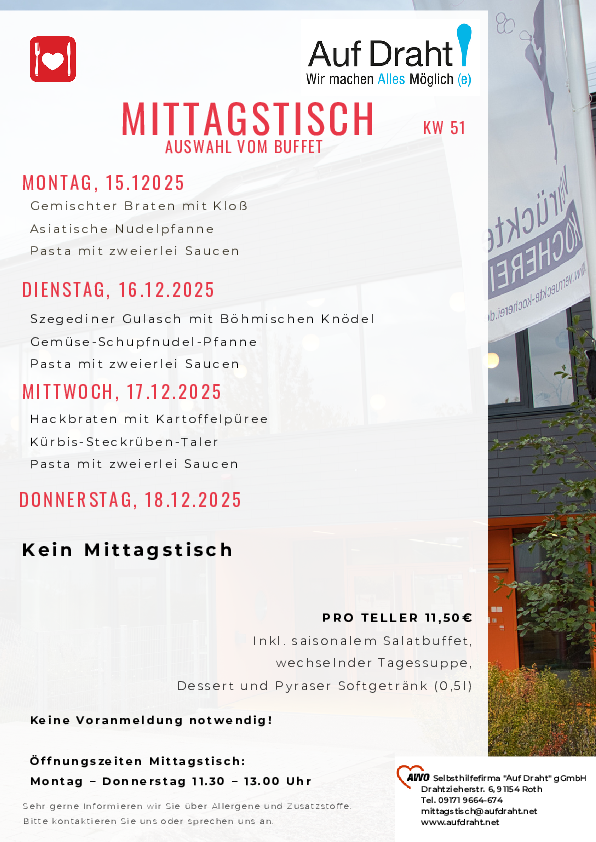 Von Montag bis Donnerstag bieten wir in unseren Räumlichkeiten in Roth ein abwechslungsreiches Mittagessen an. Eine Voranmeldung ist nicht notwendig. Wir freuen uns auf Sie!